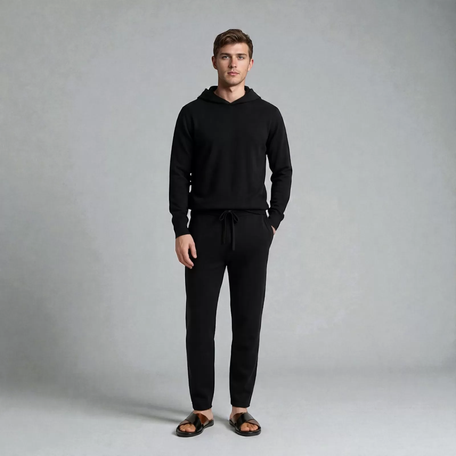 Perfect for travel between tournaments, early mornings at the stables, or evenings in the city, this hoodie blends comfort with a sharp, timeless aesthetic. The deep black tone enhances its versatility, pairing effortlessly with matching cashmere trousers for a polished look or with jeans for a more casual, off-duty style.
