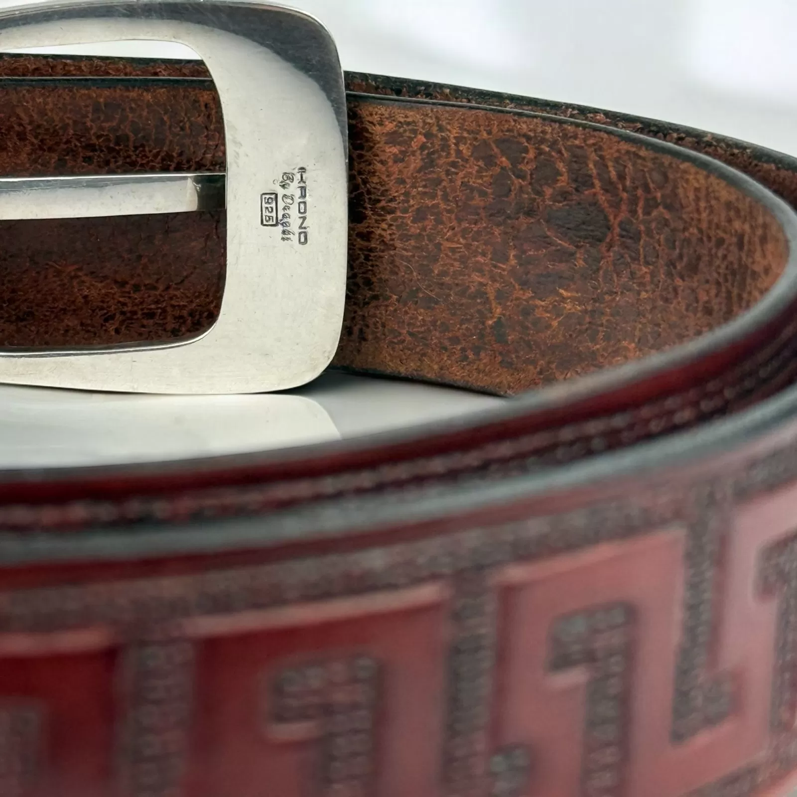 The Draghi buckle is made of Sterling Silver and the leather belt is embossed with a gaucho design.