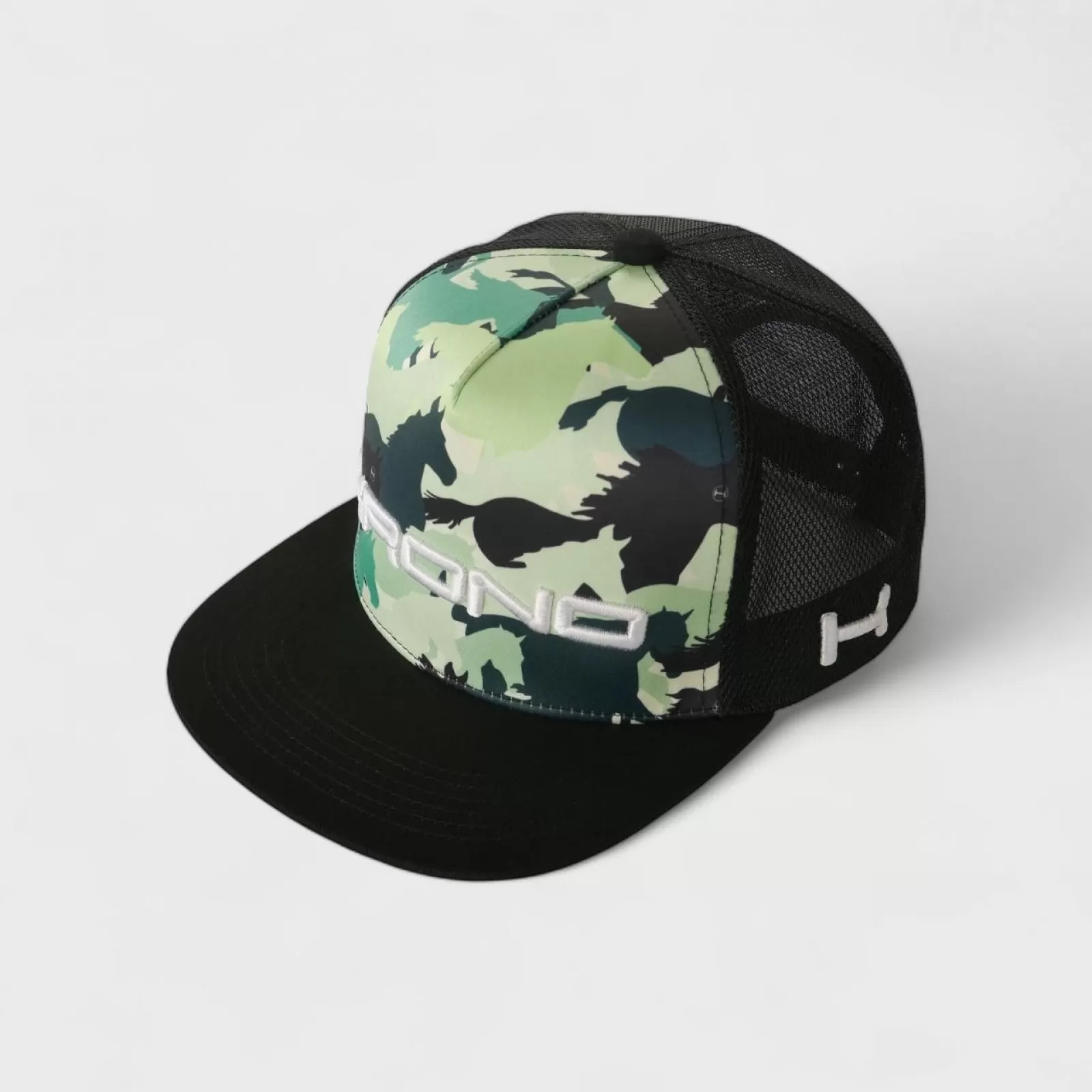 HORSE CAMOUFLAGE. The Green Horse Camo hat features a bold horse camo inspired sublimation with 3D Krono logo on this flat billed, adjustable hat style. This hat will stand out at chukkas, or anywhere you might go!