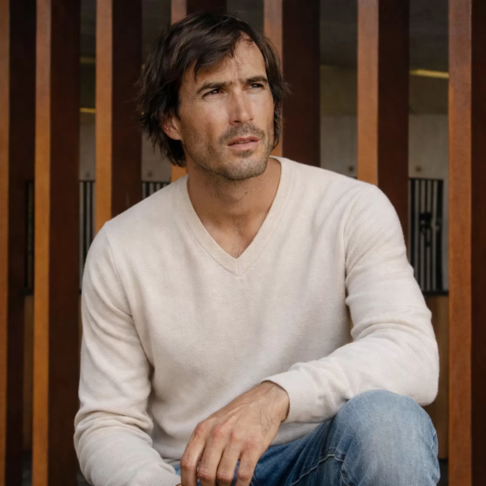 With its clean V-neck and well-balanced regular fit, it offers a refined yet relaxed silhouette. The soft grey tone evokes crisp mornings at the stables, travel days between tournaments, and understated moments at the club. Easy to layer over a shirt or under a jacket, it pairs effortlessly with denim or tailored trousers.