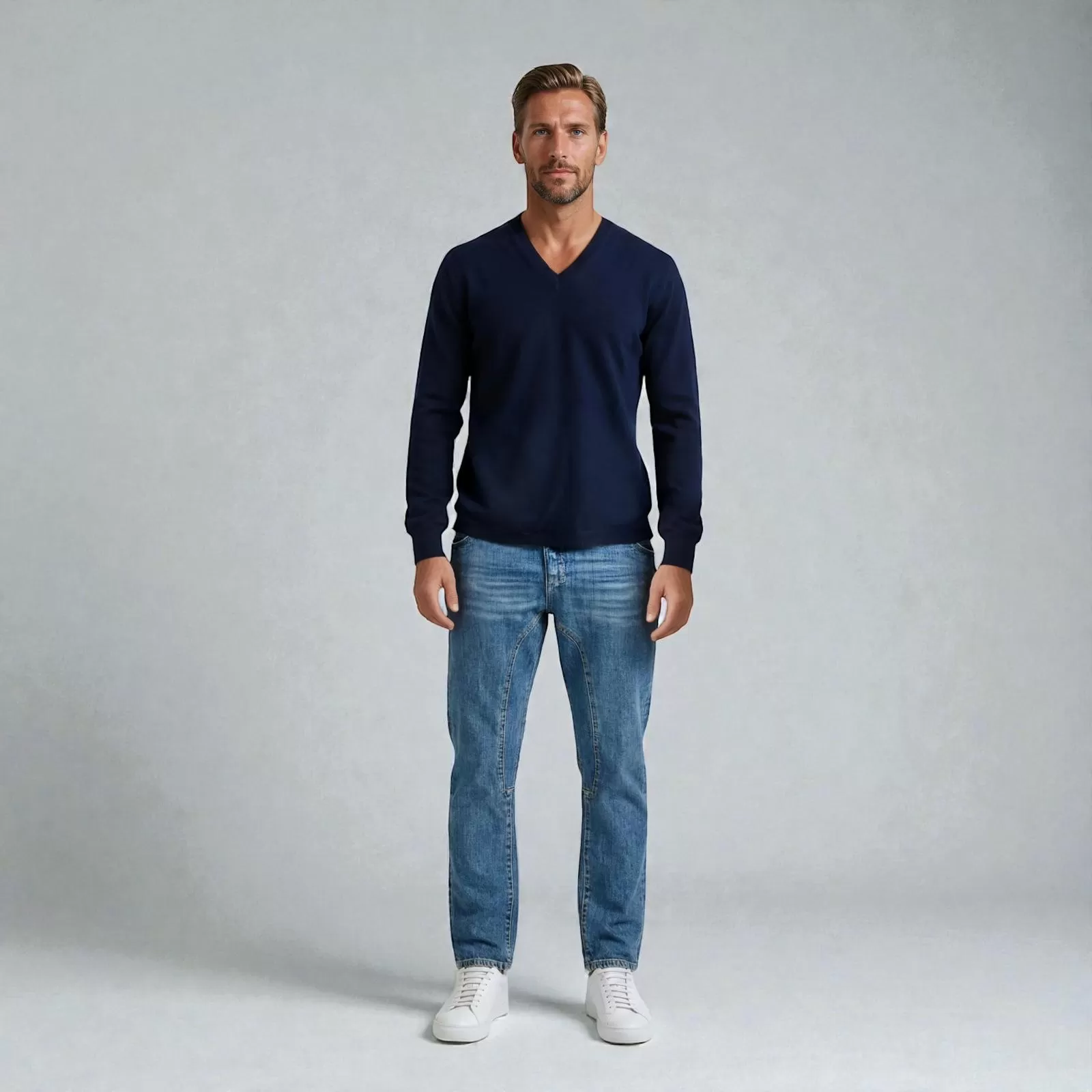 With its clean V-neck and balanced regular fit, it offers a confident yet relaxed silhouette. The navy blue tone evokes late afternoons at the club, evening drives after matches, and the quiet sophistication of traditional polo settings. Timeless and versatile, it layers effortlessly over a shirt or beneath a jacket, pairing naturally with denim or tailored trousers.