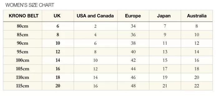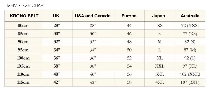The measurement of Krono Polo belts begins from the buckel's starting point and extends to the middle hole. For reference, if you wear 32" trousers or size 10 trousers, a 90 cm polo belt would be suitable for you. To determine your size, kindly refer to Krono Polo's International size chart provided below.