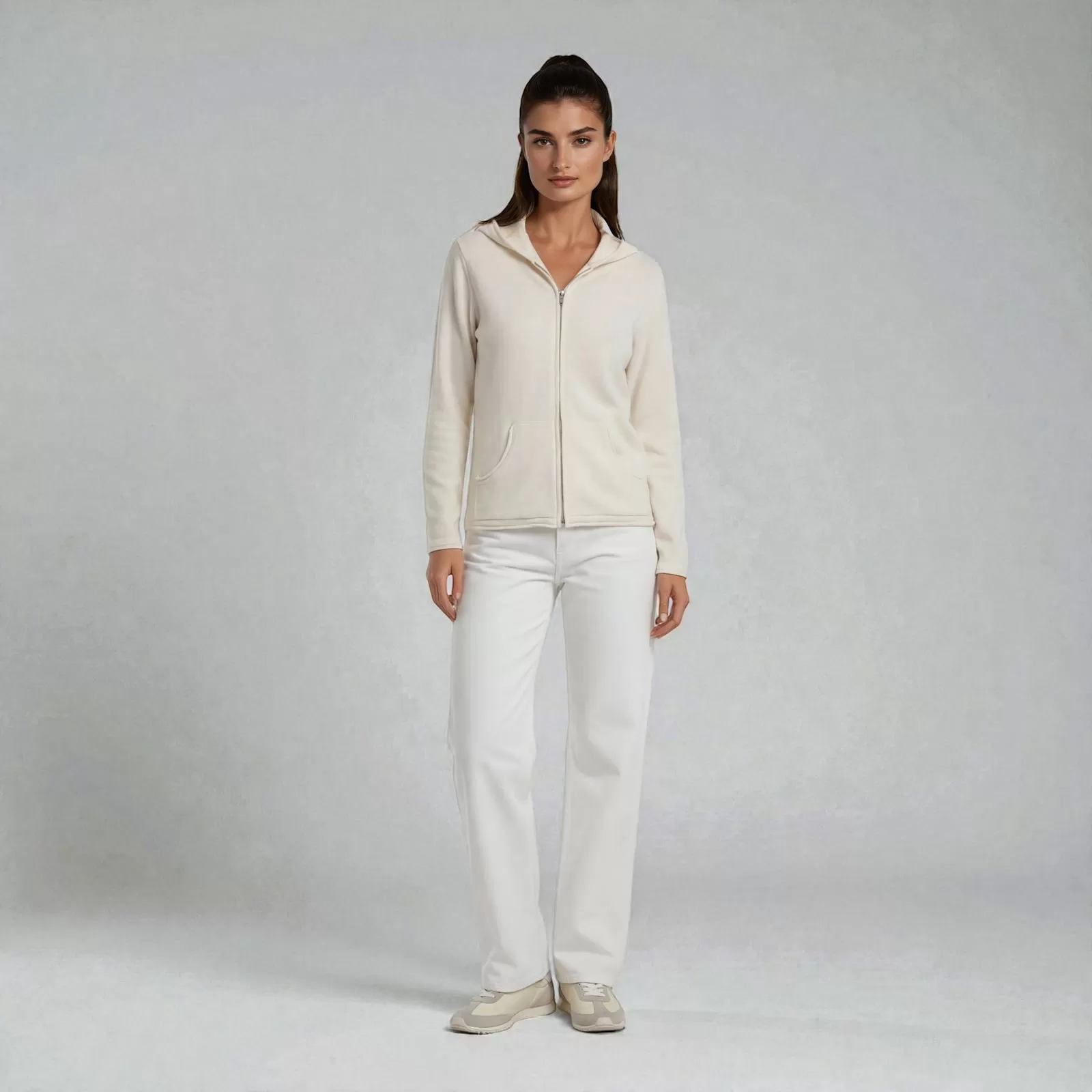 The light beige tone brings a sense of warmth and quiet sophistication, inspired by sunlit mornings at the stables and relaxed days between travel and the club. Naturally versatile, this women’s cashmere zip hoodie layers beautifully over a t-shirt or polo, transitioning seamlessly from casual moments to more polished settings.