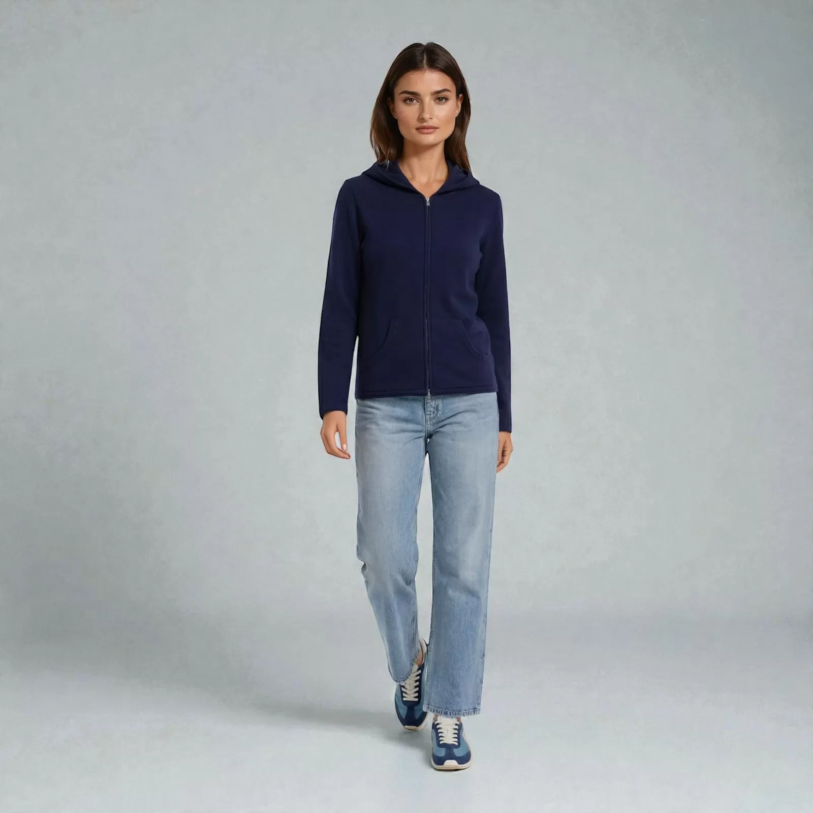 The Krono Cashmere Zip Hoodie for Women in Navy Blue reflects the timeless elegance of the polo world, where tradition meets modern refinement. Crafted in Italy from 100% pure cashmere, it offers exceptional softness, natural warmth, and a fluid silhouette designed for everyday sophistication.